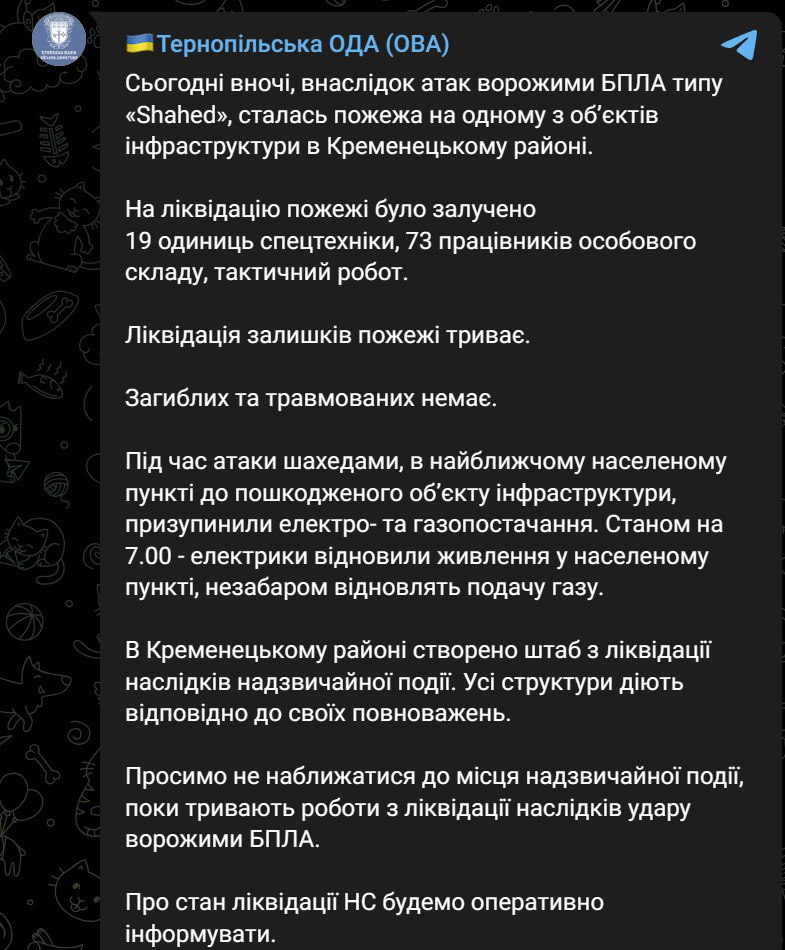 Внаслідок атаки російських БПЛА типу Shahed в ніч на вівторок, 12 березня, сталась пожежа на одному з обʼєктів інфраструктури в Кременецькому районі Тернопільської області.