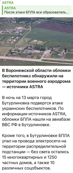 За інформацією адміністраторів каналу, в середу, 13 березня, Воронезька область зазнала атаки БПЛА. Як заявляють джерела медіа, уламки безпілотника знайшли на авіабазі ВПС Росії у Бутурлінівці.