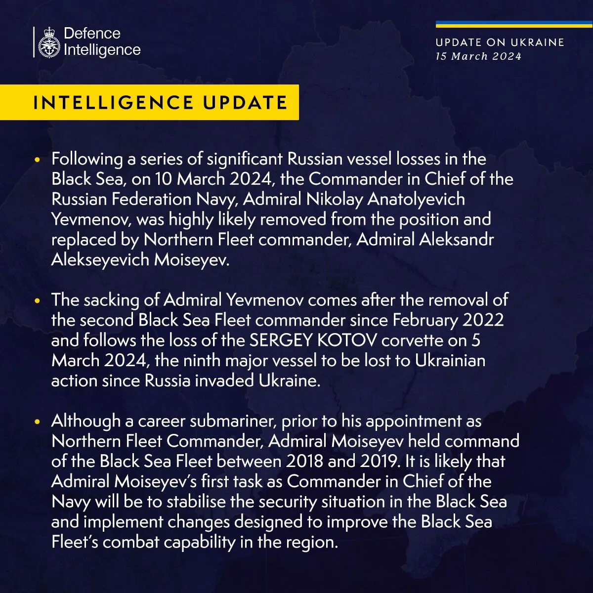 Командувач військово-морським флотом РФ адмірал Микола Євменов після серії значних втрат російських кораблів, імовірно, був відсторонений з посади 10 березня. Його, ймовірно, замінив командувач Північного флоту адмірал Олександр Моїсеєв. Першим завданням нового глави ВМФ РФ, очевидно, стане стабілізація ситуації в Чорному морі та підвищення боєздатності Чорноморського флоту.