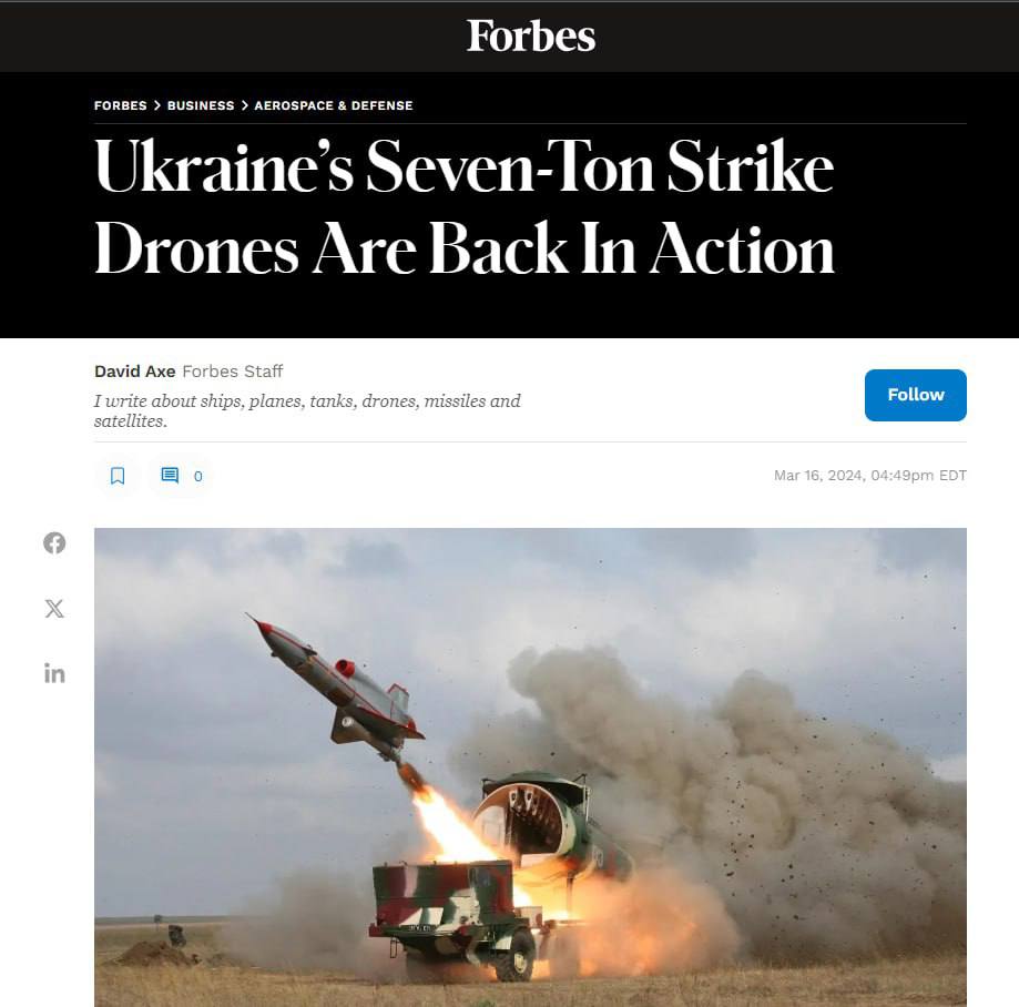 Видання Forbes пише, що українські семитонні ударні дрони знову в дії.