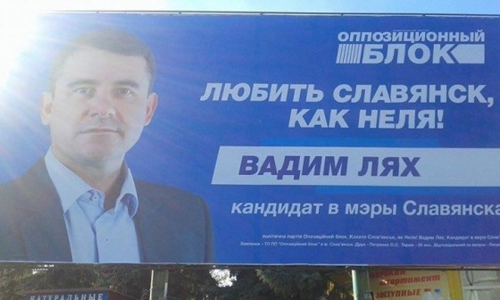 Кандидат от Оппоблока в Славянске Вадим Лях. «Любить Славянск, как Неля» — подразумевается экс-мэр Сдавянска Неля Штепа, приветствовавшая в городе захватчиков-террористов и сотрудничавшая с ними вплоть до поимки и препровождения в СИЗО