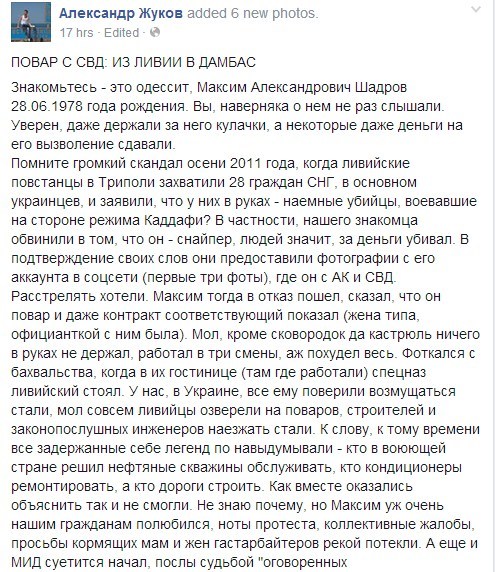 "Знакомьтесь - это одессит, Максим Александрович Шадров 28.06.1978 года рождения. Вы, наверняка о нем не раз слышали… Помните громкий скандал осени 2011 года, когда ливийские повстанцы в Триполи захватили 28 граждан СНГ, в основном украинцев, и заявили, что у них в руках - наемные убийцы, воевавшие на стороне режима Каддафи? В частности, нашего знакомца обвинили в том, что он - снайпер, людей значит, за деньги убивал", - написал Жуков.