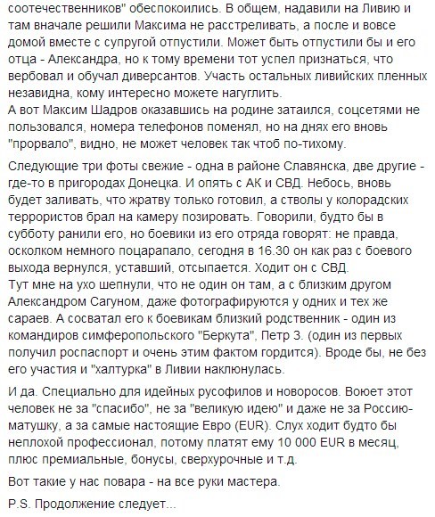 "Специально для идейных русофилов и новороссов. Воюет этот человек не за "спасибо", не за "великую идею" и даже не за Россию-матушку, а за самые настоящие евро (EUR). Слух ходит будто бы (он) неплохой профессионал, потому платят ему 10 000 EUR в месяц, плюс премиальные, бонусы, сверхурочные и т.д. Вот такие у нас повара - на все руки мастера" - написал одессит на своей странице в Facebook.