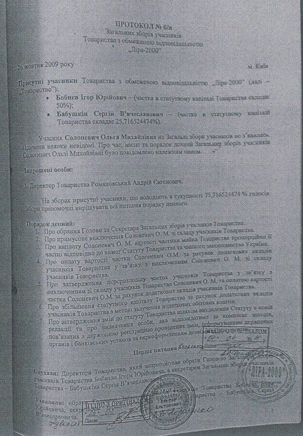 Понятно, что такая несправедливая сделка не могла обрадовать Ольгу Солоневич. После отказа Ольги принять предложенные ей отступные за отобранные корпоративные права, судебная тяжба разгорелась с новой силой. Был подан иск о признании недействительным решения общего собрания ТОВ «Лира-2000» про исключение Солоневич из числа участников. 22 января 2014 года Киевский апелляционный Хозяйственный суд вынес постановление об удовлетворении требований Ольги Солоневич и восстановил ее права в полном объеме.