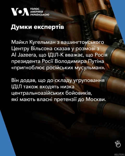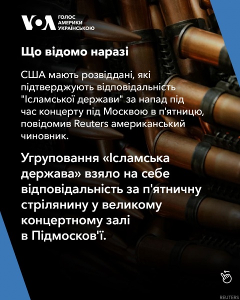 Розвідка Сполучених Штатів Америки (США) має у своєму розпорядженні дані, що підтверджують відповідальність угруповання "Ісламська держава" (ІДІЛ) за вчинення вчорашнього теракту в торговому центрі "Крокус Сіті Холл" під Москвою.