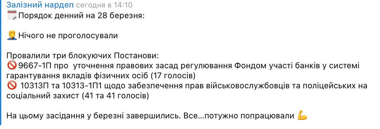 Як повідомляє нардеп Железняк, депутати провалили три постанови, які блокують ухвалення вже проголосованих Радою законопроектів.