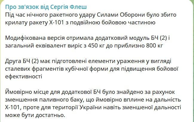 Фахівець із безпілотників Сергій «Флеш» Бескрестнов заявив, що під час нічного ракетного удару ЗСУ збили крилату ракету Х-101 з подвійною бойовою частиною.