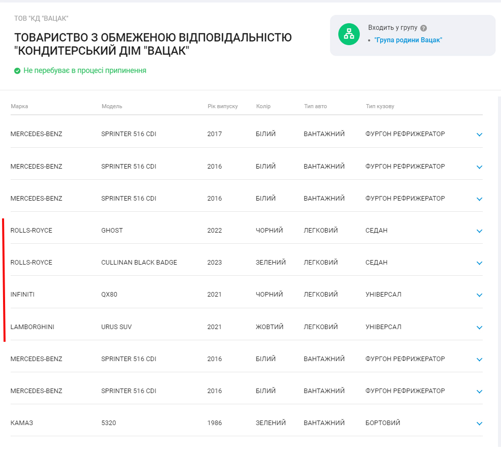 З кондитерським бізнесом так само не все просто. Згідно з даними реєстрів КД «Вацак» зареєстровано тільки у 2019 році, хоча на сайті підприємства зазначається, що створено воно було у 2001 році. Тобто дослідити, що відбувалось з фінансовими потоками компанії за період строком у 18 років не видається можливим.