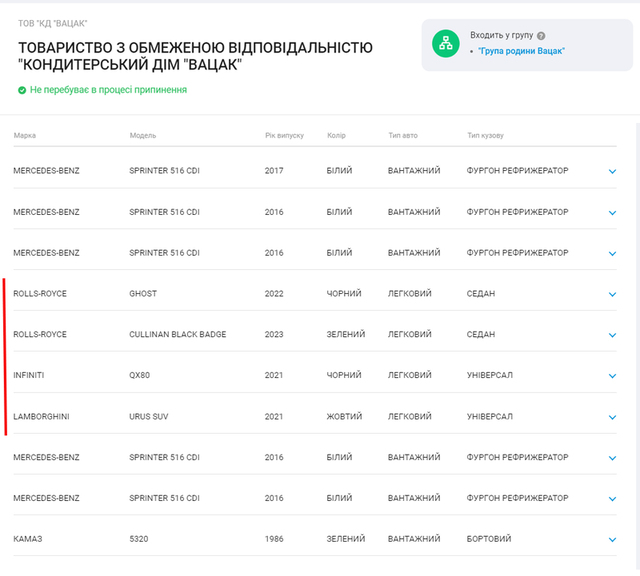 Найбільш розкішні автівки у колекції Вацак записує у власність своєї кондитерської компанії. Адже насправді, згідно з його фінансовою звітністю, він не міг би собі дозволити навіть одне таке авто. Його дохід у 2023 році склав 642 тисячі гривень, його дружини Вікторії – 5 млн 514 тисяч гривень. Готівки Вацак має у розмірі 480 000 гривень, його дружина – 2 млн 150 тис гривень. Кошти на рахунках у банках сягають декількох сотень тисяч.