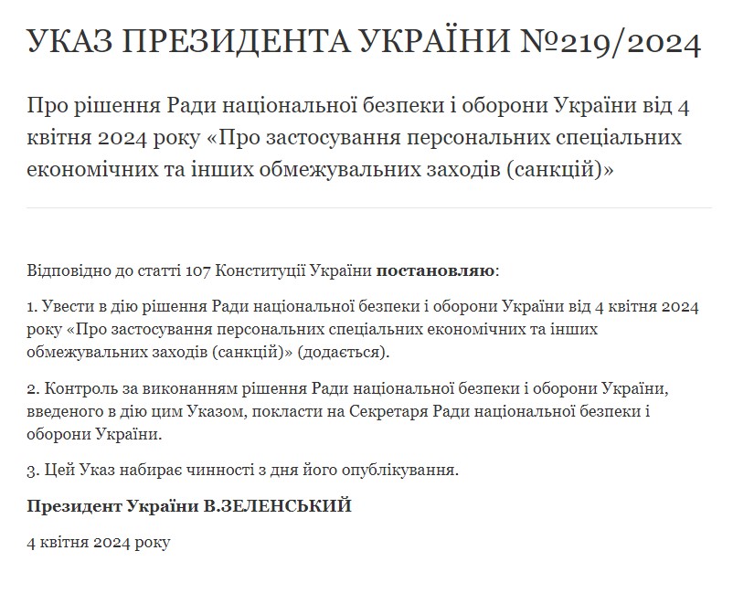 Про це йдеться у його указі від 4 квітня. Також санкції продовжено проти інших бізнесменів, підозрюваних у контрабанді.