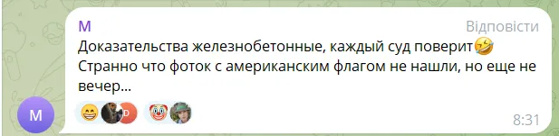 "Це, звичайно, 5. У телефоні у 10-річного підлітка знайшли фотографії динозаврів і Скібіду-унітаза, що доводить зв’язок знищення динозаврів фекаліями за участю малолітнього хулігана", "Докази залізобетонні, кожен суд повірить. Дивно,що фоток з американським флагом не знайшли, але ще не вечір", "Так ІДІЛ узяв же на себе відповідальність, але всі продовжують шукати український слід", "А якщо в телеграм, буває, завантажуються всі фото з каналів новин? Там новини і про Україну, і фото, які вони розміщують – і все це чомусь потрапляє у пам’ять телефона", – пишуть коментатори.