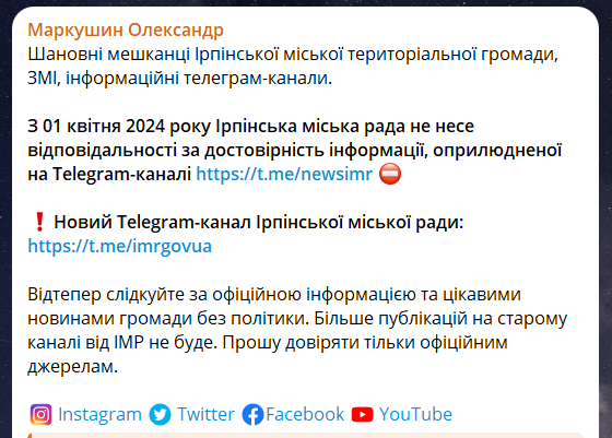 На своєму особистому ТГ-каналі Маркушин заявив, що з 1 квітня міськрада не несе відповідальності за правдивість інформації, оприлюдненої на ТГ-каналі “Ірпінська міська громада – новини” (лояльний до Карплюка і “Нових облич”) та закликав слідкувати за новинами міста на ТГ-каналі міськради (лояльний до Маркушина).