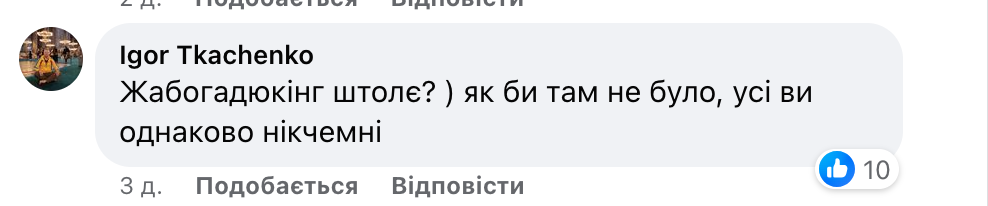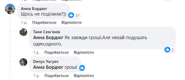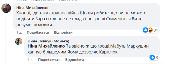 Якщо проаналізувати коментарі під дописами Карплюка і Маркушина, то можна вийти приблизно на такий тематичний набір висловлювань: “Смішно”, “жабогадюкінг”, “не поділили корито”, “учень переплюнув учителя”, “клоуни”, “в країні війна, а вони владу ділять”, “хай передавлять одне одного”, “позор!”.