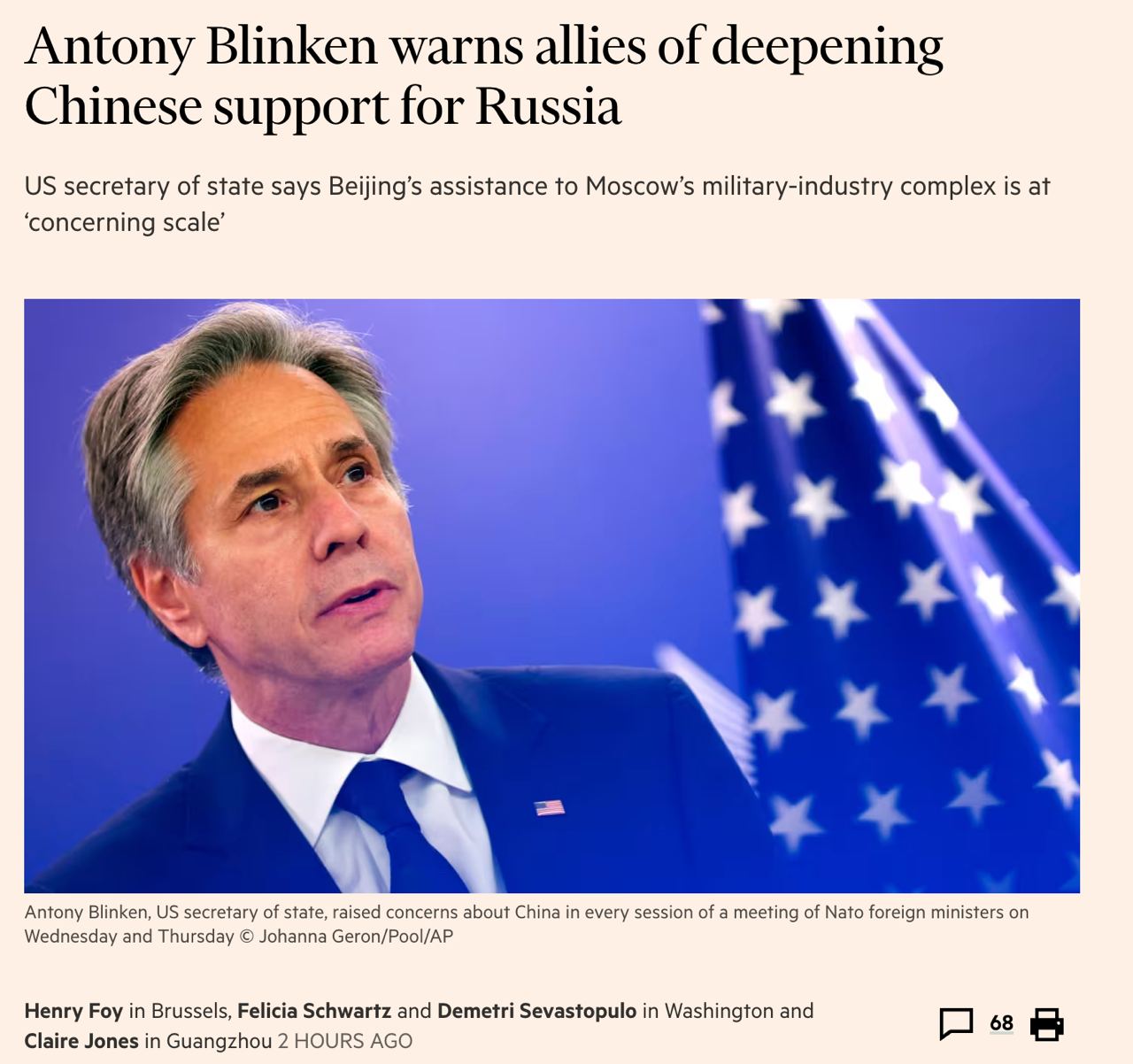 Ентоні Блінкен заявив європейським союзникам, що Китай нарощує свою підтримку РФ, - FT