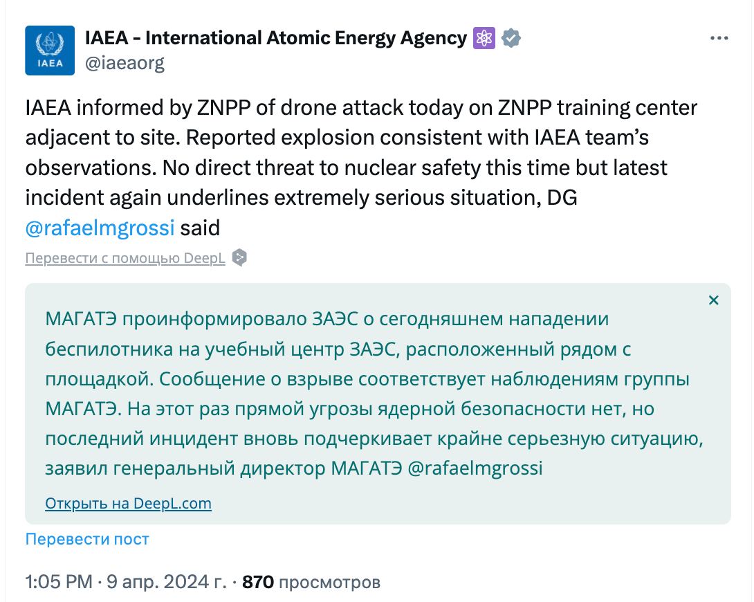 "Повідомлення про вибух відповідає спостереженням групи МАГАТЕ. Цього разу прямої загрози ядерній безпеці немає, але останній інцидент знову наголошує на вкрай серйозній ситуації", - заявив гендиректор МАГАТЕ Гроссі.