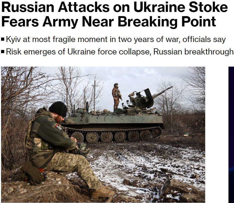 Видання Bloomberg пише, що Київ перебуває у найвразливішому становищі за два роки війни, існує ризик колапсу українських сил і прориву Росії.