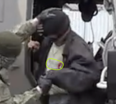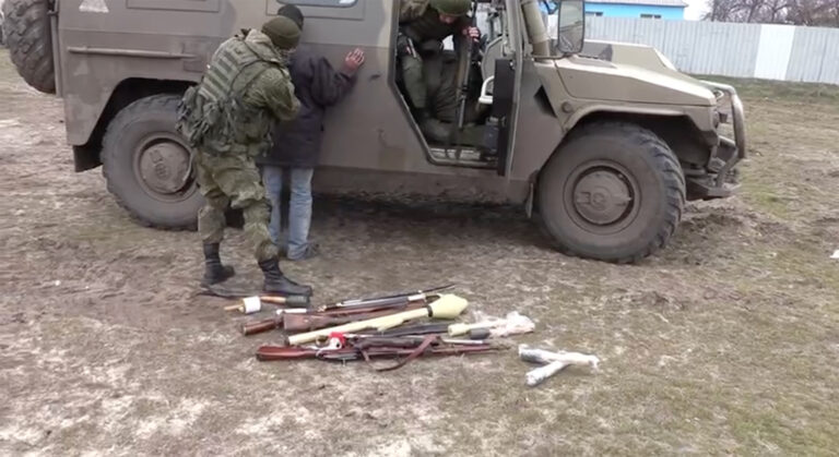 На відео видно трьох військовослужбовців ЗС РФ і чути закадровий голос оператора. Двоє з військових у кадрі ймовірно належать до так званих військ “ЛНР” та/або “ДНР”. На це вказують георгіївські стрічки, які, зі слів свідків в Ізюмі, носили тільки представники цих угрупувань34. Щобільше, їхнє екіпірування виглядає значно гіршим ніж те, що має військовослужбовець, якому передали автомат. Це збігається зі свідченнями очевидців, які розповідали, що військові “ЛНР” та “ДНР” мали гірше екіпірування, ніж у ЗС РФ35.
