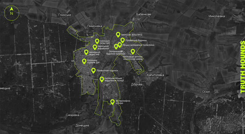 На карті м. Ізюм позначені місця незаконного утримання та катування місцевих мешканців. Джерело: Truth Hounds