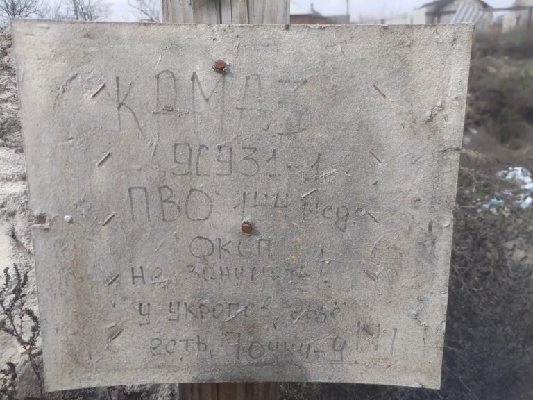 Табличка зі згадкою про 144-ту гвардійську мотострілецьку дивізію на подвір’ї Ізюмської школи №2. Джерело: Truth Hounds 25 березня 2023 року