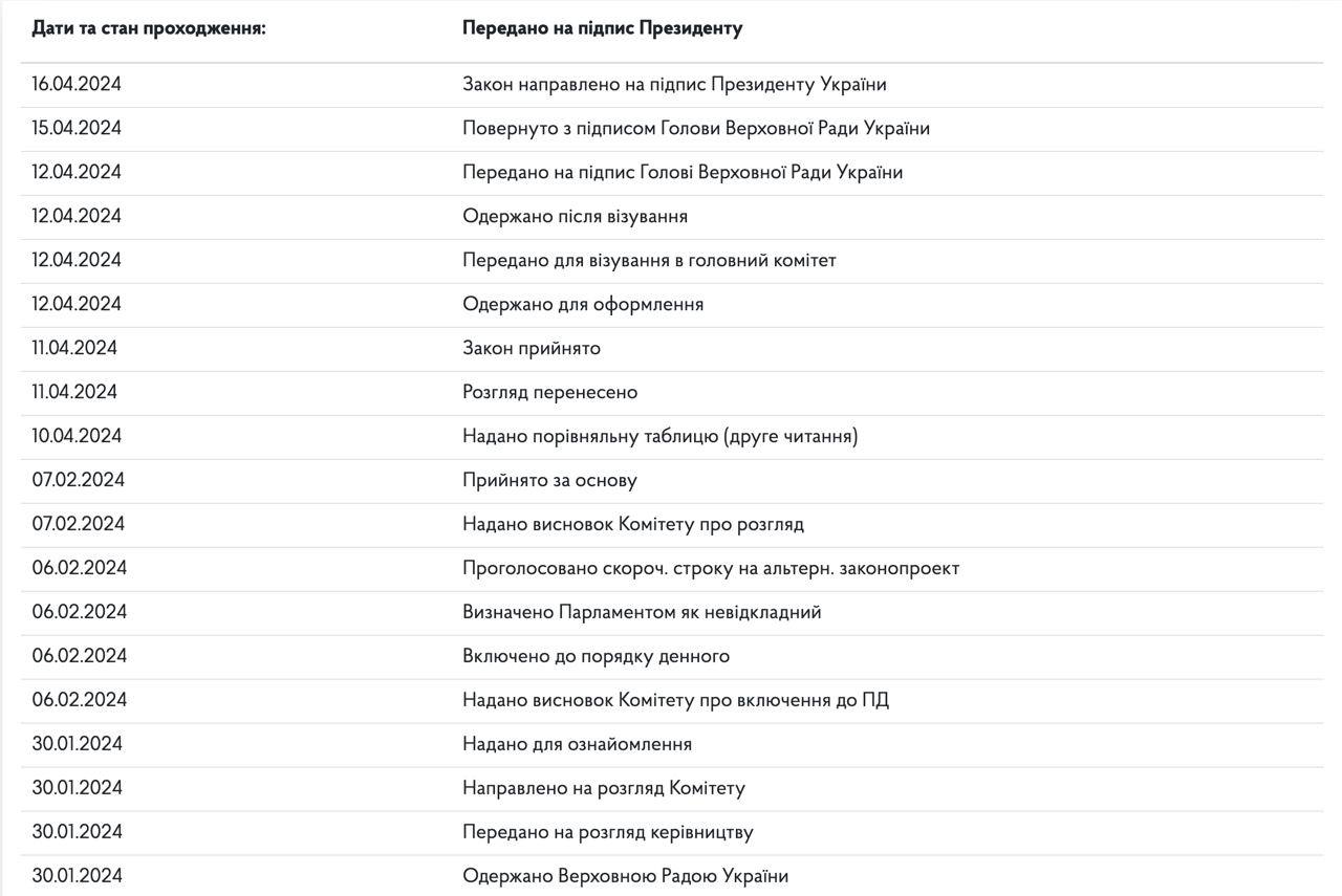 У його картці на сайті Ради йдеться, що документ уже підписано спікером парламенту Стефанчуком та направлено на підпис президенту.