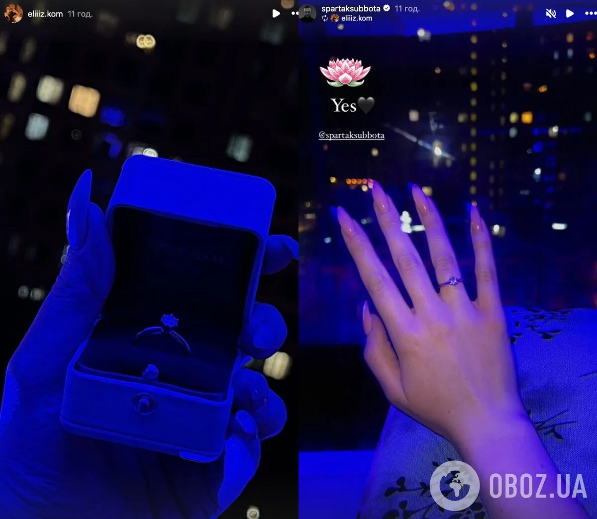 Єлизавета показала фото з обручкою та написала: "Так", а поруч залишила позначку свого нареченого. Він це перерепостив, повідомляючи своїм 150 тисячам підписників новину.