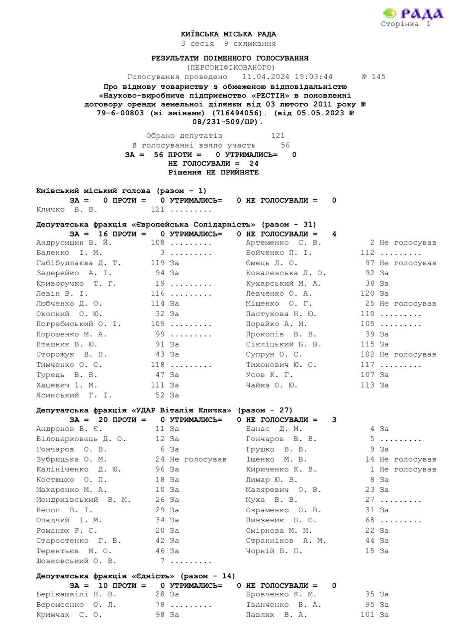 Депутати Київської міської ради від «Слуги Народу» та ОПЗЖ провалили голосування і не підтримали відмову у продовженні оренди «НВП «Рестін».