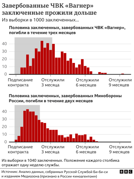 "Аналіз зібраних даних показує, що втрати вагнерівців розподілені більш-менш рівномірно. А от ув’язнені, які воювали в підрозділах Міноборони, гинули невдовзі після приїзду на фронт. Половину всіх встановлених нами загиблих ув’язнених із ПВК "Вагнер" було вбито через три місяці після підписання контракту. У випадку із загонами "Шторм" – половину відомих загиблих засуджених було вбито протягом перших 8 тижнів на фронті – тобто в середньому вони жили на місяць менше, ніж ув’язнені вагнерівці", – пише видання.