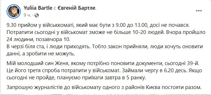 "9.30, прийом у військкоматі, який має бути з 9.00 до 13.00, досі не розпочався. Потрапити сьогодні до військкомату зможе не більше 10-20 осіб. Учора пройшли 24 особи, позавчора 10. У черзі близько ста, і люди приходять. Тобто закон ухвалили, люди хочуть оновити дані, а зробити не можуть», – написала киянка Юлія Бартле.