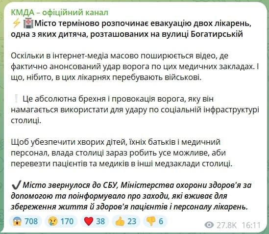 У Києві терміново евакуюють дві лікарні, одна з яких дитяча, — КМДА