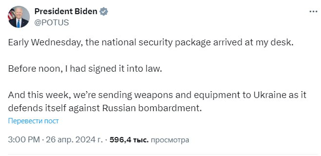 Президент США Джо Байден повідомив у Х, що зброя для України буде відправлена Штатами вже цього тижня.