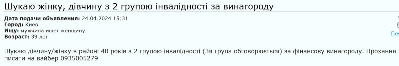 "Шукаю жінку, дівчину з 2 групою інвалідності за винагороду", "Шукаю багатодітну дівчину", – такі оголошення розміщені на одному з профільних ресурсів.
