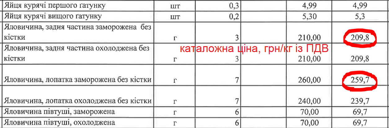 У березні Конотопська центральна районна лікарня на Сумщині замовила у підприємця заморожену яловичину вищого сорту в блоках за тим самим ГСТУ по 170 грн/кг без ПДВ. З урахуванням 20% податку ціна склала б 204 грн/кг. Це на 33% дешевше від ціни РАЕС.