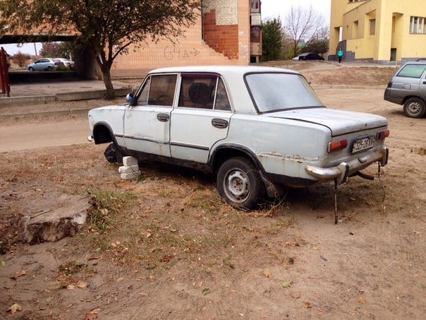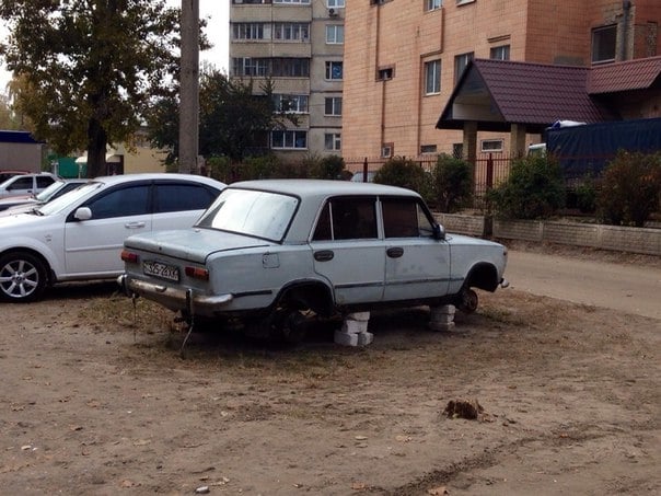 Во дворе одной из многоэтажек, что на Профсоюзном бульваре в Харькове, неизвестные сняли колесо у белых "Жигулей", а ступицы обмотали мусорными пакетами.