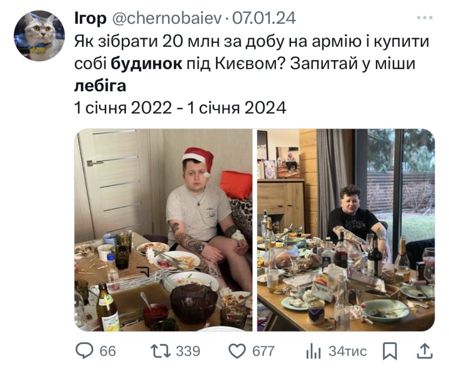 «Покажіть спочатку звіти, що Лебіга зібрав, що купив, що привіз, кому передав. Тільки не якісь абстрактні таблички xl з фейковиминайменуваннями, а акти прийому передачі з відповідними печатками, підписами та іншим», — обурюються люди, що й не дивно зважаючи на те, які суми проходили через блогера перед придбанням нерухомості.
