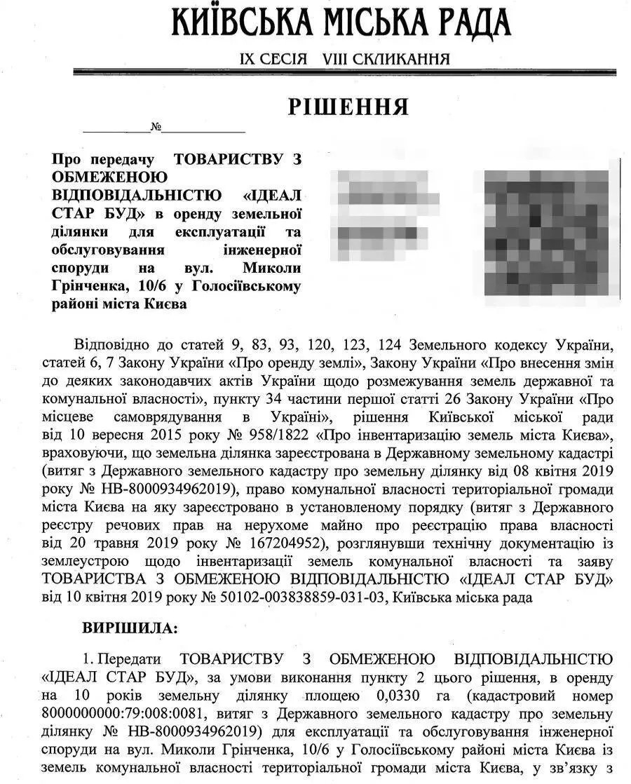 Раніше ЗМІ вдалося з’ясувати, що у 2019 році Київська міська рада ухвалила рішення передати земельну ділянку в оренду ТОВ "Стар Ідеал Буд" для експлуатації та обслуговування інженерної споруди на вул. Миколи Грінченка, 10/6 у Голосіївському районі Києва.