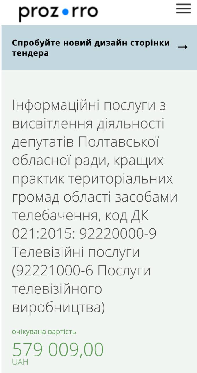 На замовлення «інформаційних послуг із висвітлення діяльності депутатів Полтавської обласної ради, кращих практик територіальних громад області засобами телебачення» з бюджету заплановано виділити 579 009 гривень.