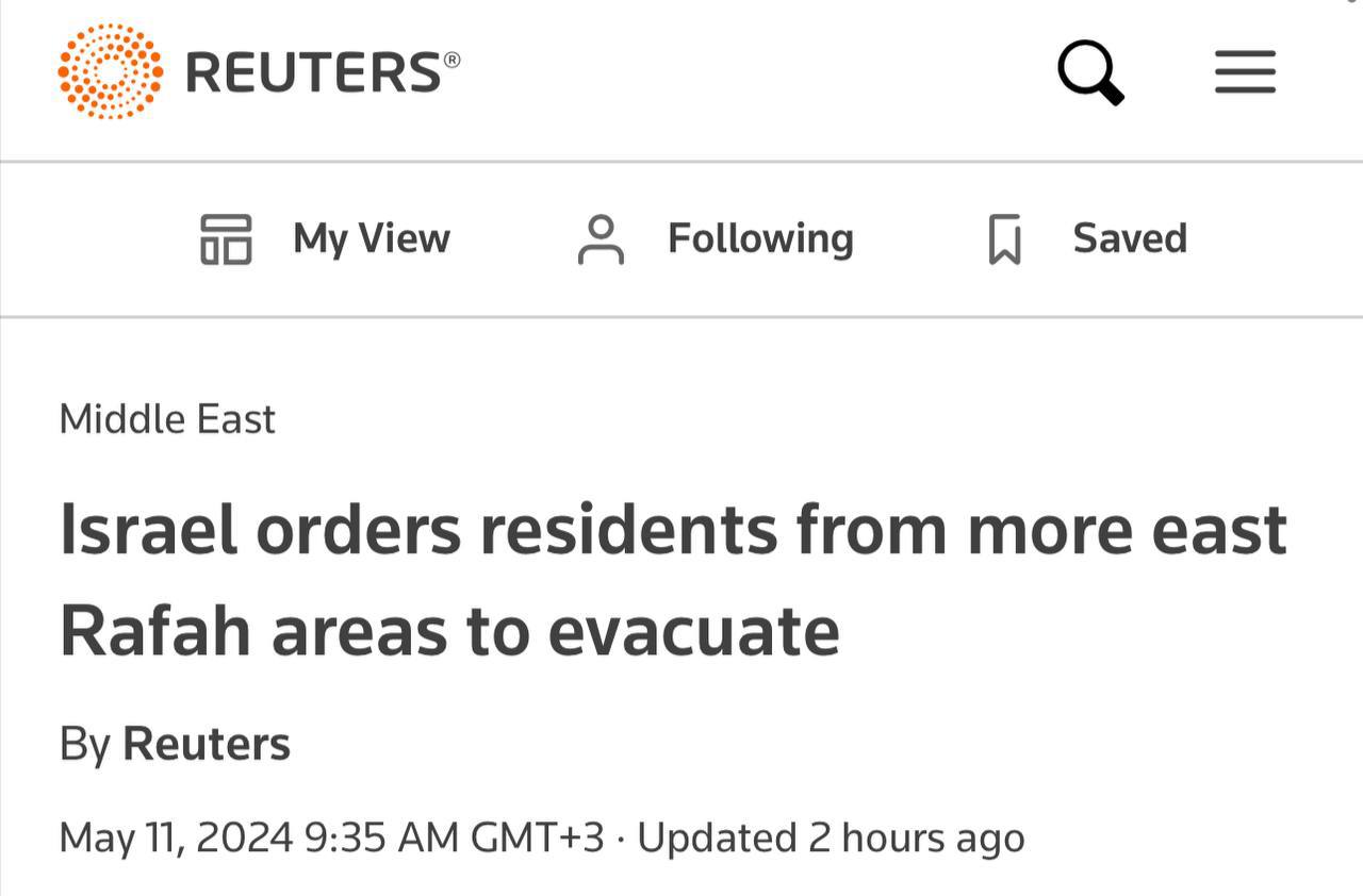 Reuters пише, що Ізраїль розширює операцію в Рафаху. Цахал закликає мешканців залишити місто.