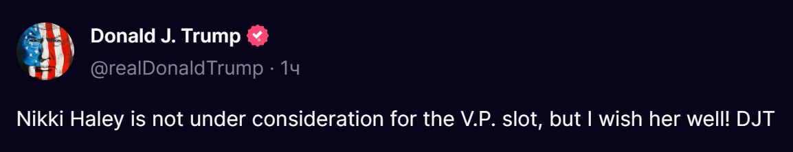 "Ніккі Гейлі не розглядається на посаду віцепрезидента", - написав Трамп у соцмережі Truth Social.