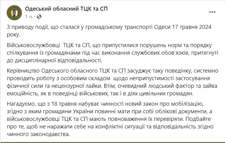 Одеське обласне ТЦК опублікували повідомлення, де прокоментували сьогоднішній інцидент у маршрутці між їхніми співробітниками та цивільними.