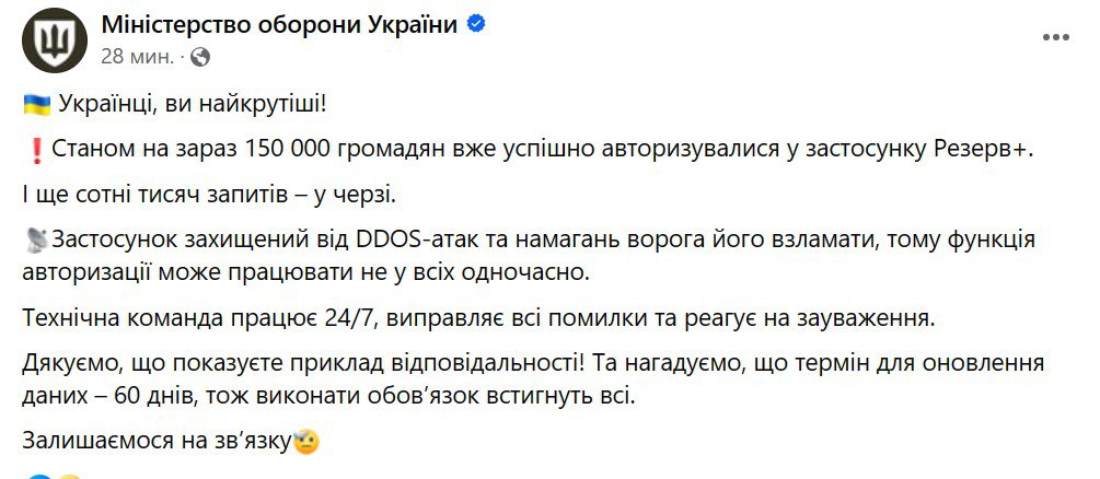 За даними МО, сотні тисяч користувачів чекають на авторизацію в застосунку. "Застосунок захищений від DDOS-атак і спроб ворога його зламати, тому функція авторизації може працювати не у всіх одночасно", – пояснило відомство.