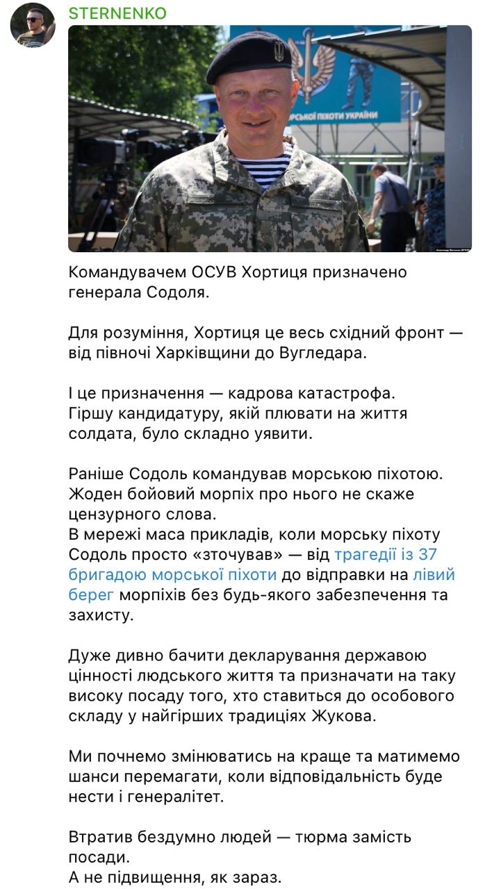 "Це призначення – кадрова катастрофа. Найгіршу кандидатуру, якій начхати на життя солдата, було складно уявити. Раніше Содоль командував морською піхотою. Жоден бойовий морпіх про нього не скаже цензурного слова. У мережі безліч прикладів, коли морську піхоту Содоль просто «стачував» - від трагедії з 37-ю бригадою морської піхоти до відправлення на лівий берег морпіхів без будь-якого забезпечення та захисту", - пише Стерненко.