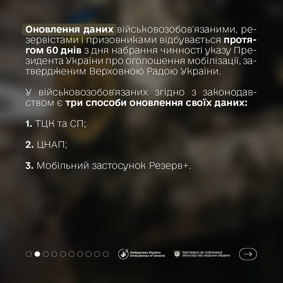 Військовозобов’язані повинні оновити облікові дані протягом 60 днів з дня, коли закон про мобілізацію набрав чинності, тобто до 16 липня 2024 року.