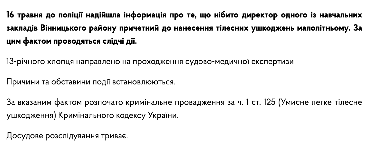 У школі на Вінничині директора звинуватили в побитті 13-річного школяра. Зокрема, учня вигнали з класу за погану поведінку, тож він вирішив перечекати до перерви на вулиці. Далі, хлопець каже, що його побачив директор та підізвав до себе. Коли ж він підійшов, керівник виламав різку та буцімто вдарив підлітка двічі. За словами мами школяра, яка звернулася до поліції, для директора це звичні виховні методи.