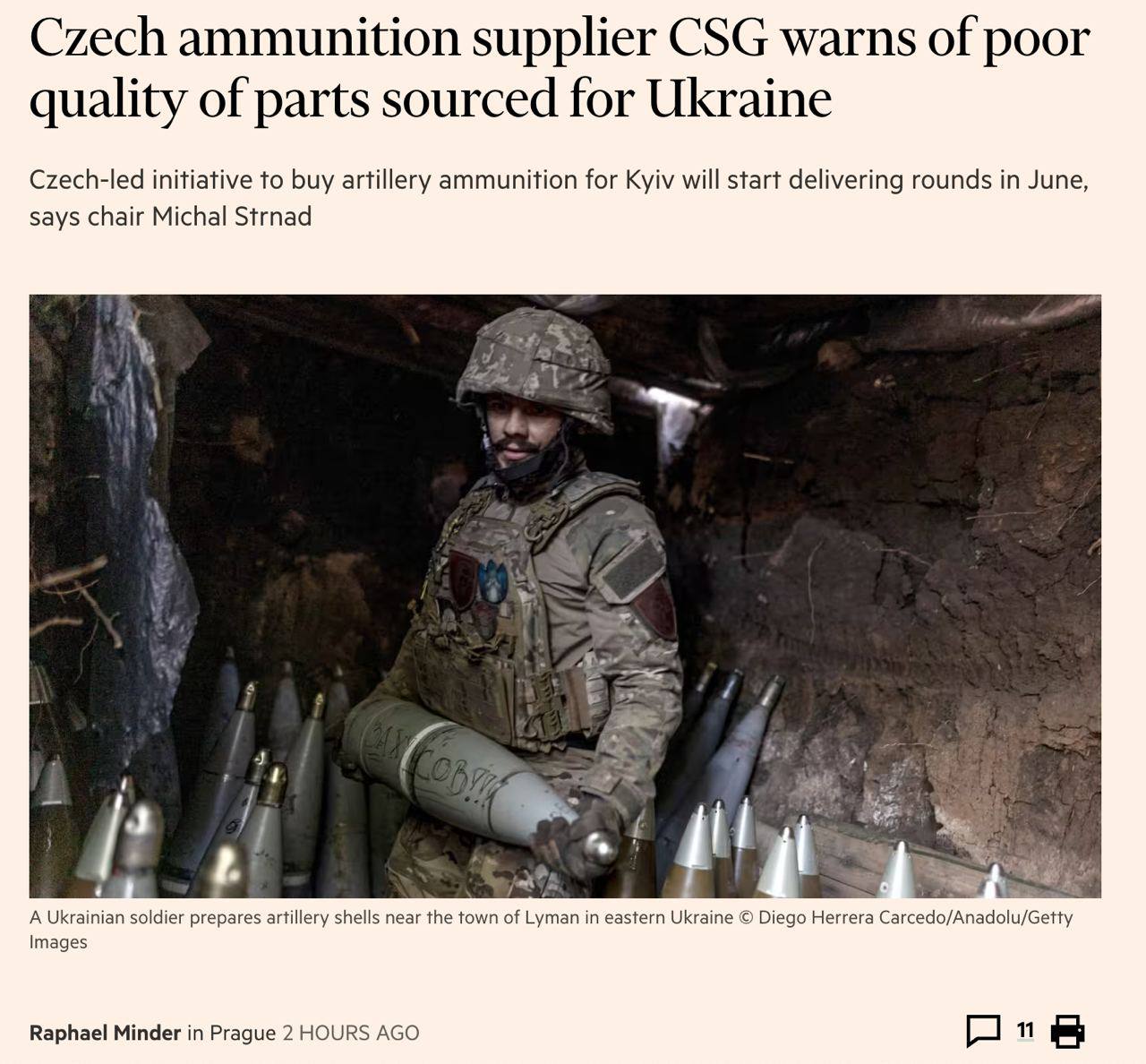 Financial Times, посилаючись на компанію-постачальника, пише, що половина снарядів, закуплених Чехією для України в країнах Африки та Азії, виявилися неякісними.