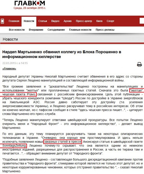 То же самое утверждал и украинский депутат Николай Мартыненко полгода назад по поводу уголовного дела в той же Швейцарии: "Желтая чешская газета, заказные статьи в швейцарской SonntagsZeitung, информационное киллерство Лещенко на проплаченных статьях..."