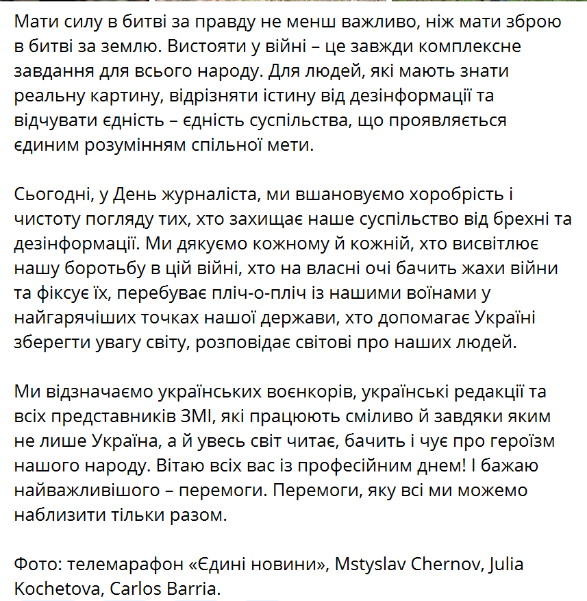 "Сьогодні, у День журналіста, ми вшановуємо хоробрість і чистоту погляду тих, хто захищає наше суспільство від брехні та дезінформації", – наголосив український лідер.