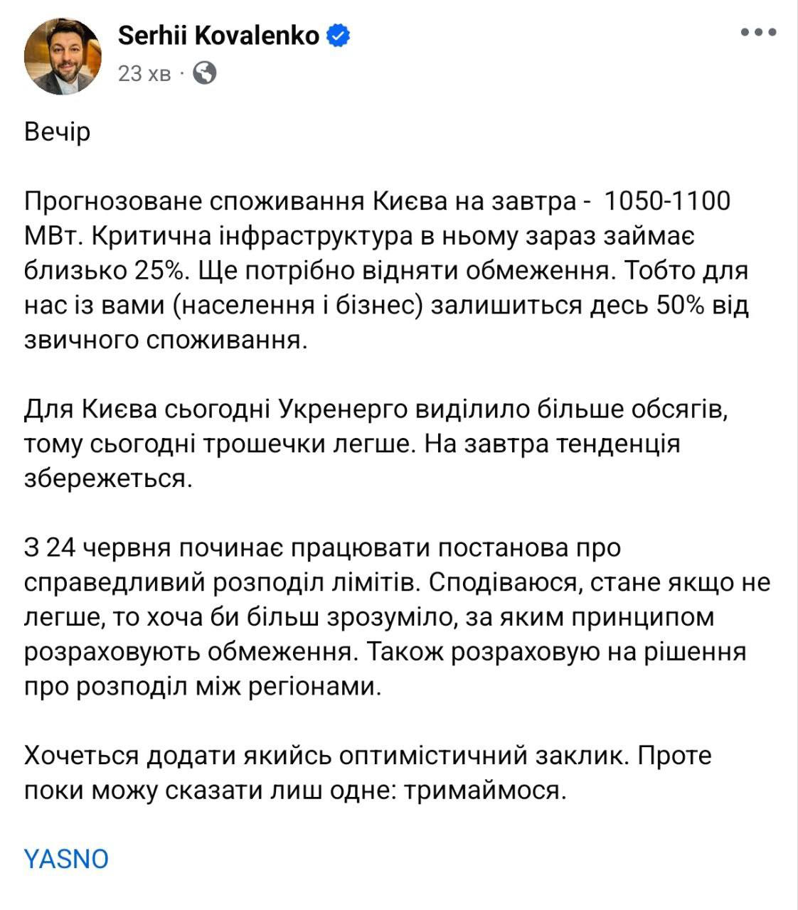 Про це повідомив гендиректор Yasno Сергій Коваленко.
