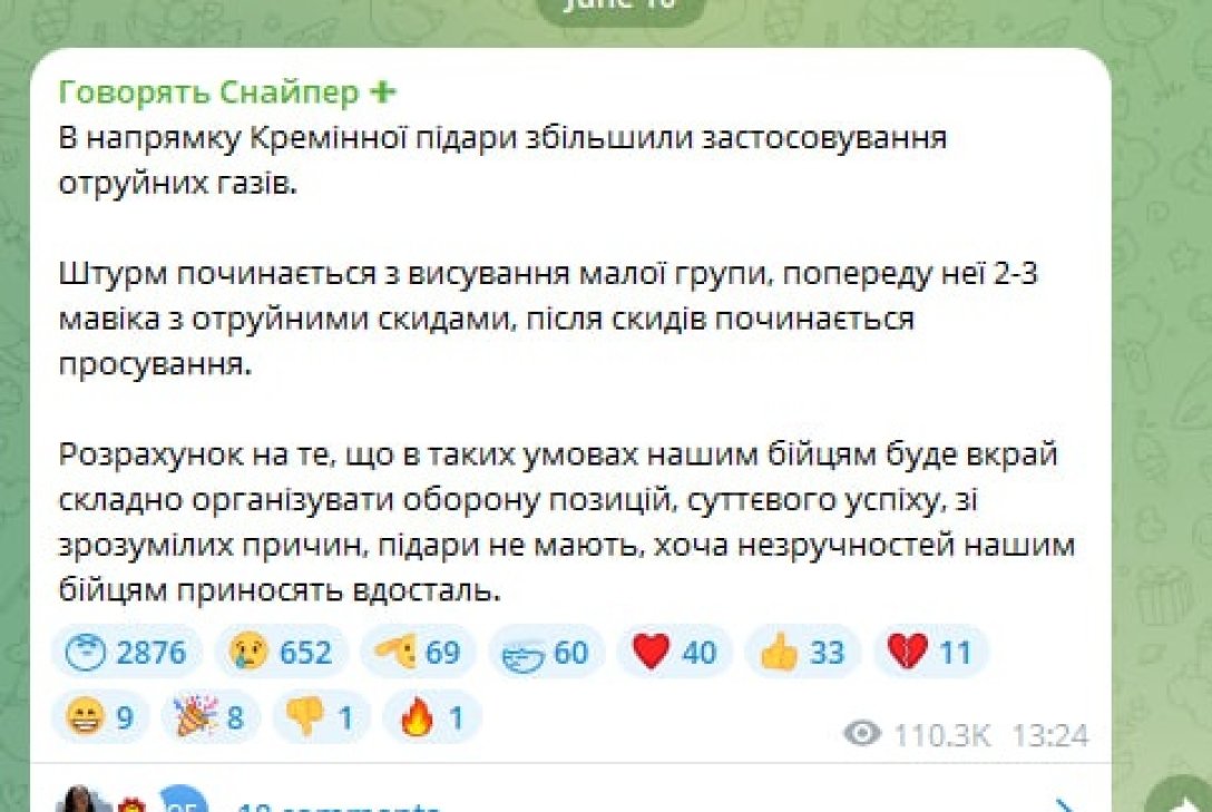 "В напрямку Кремінної п**ари збільшили застосовування отруйних газів. Штурм починається з висування малої групи, попереду неї 2-3 "мавіка" з отруйними скидами, після скидів починається просування. Розрахунок на те, що в таких умовах нашим бійцям буде вкрай складно організувати оборону позицій, суттєвого успіху, зі зрозумілих причин, п**ари не мають, хоча незручностей нашим бійцям приносять вдосталь", — йдеться в повідомленні.