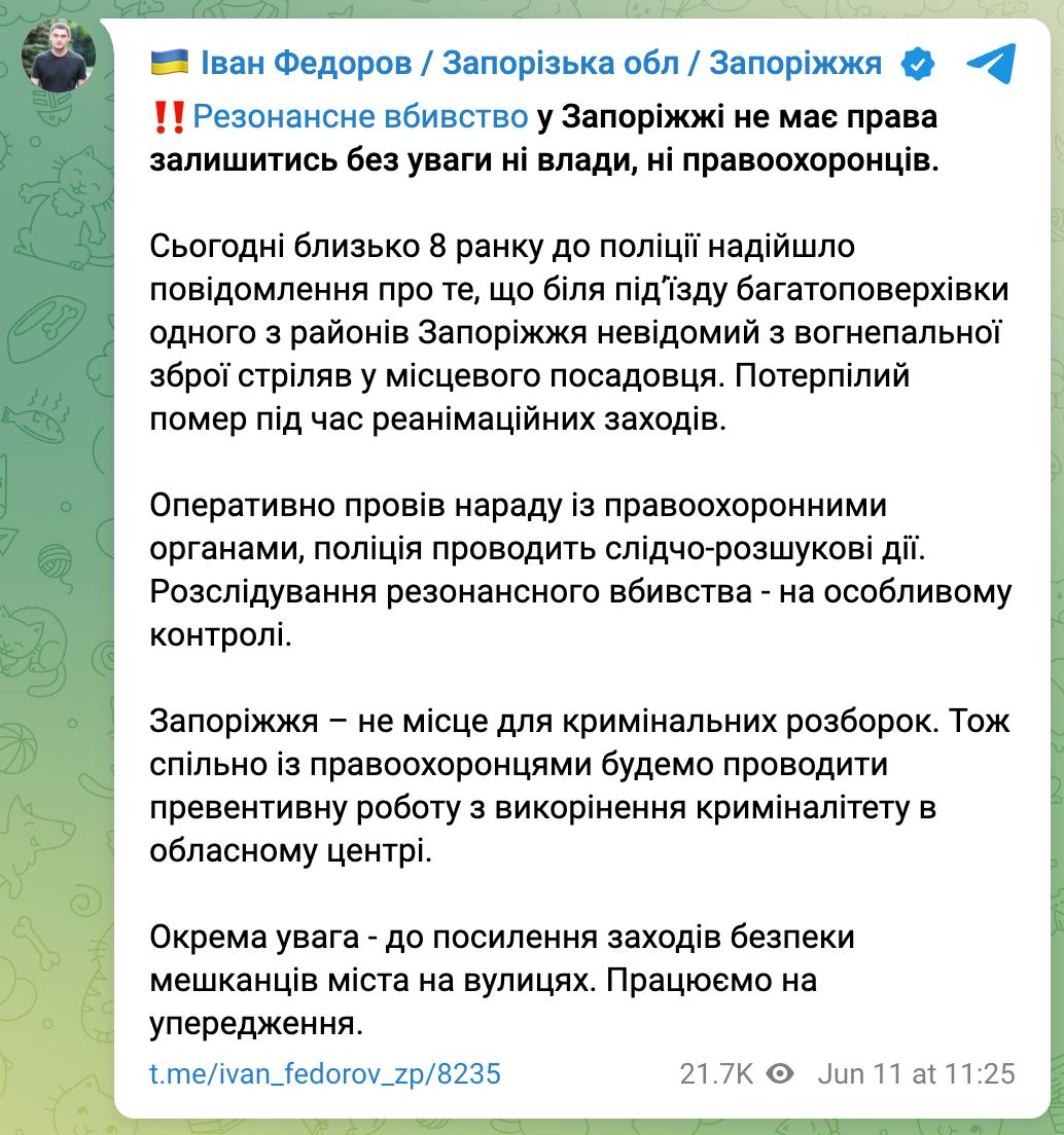 Запорізький губернатор Федоров звинуватив криміналітет у вбивстві чиновника Максима Денщика