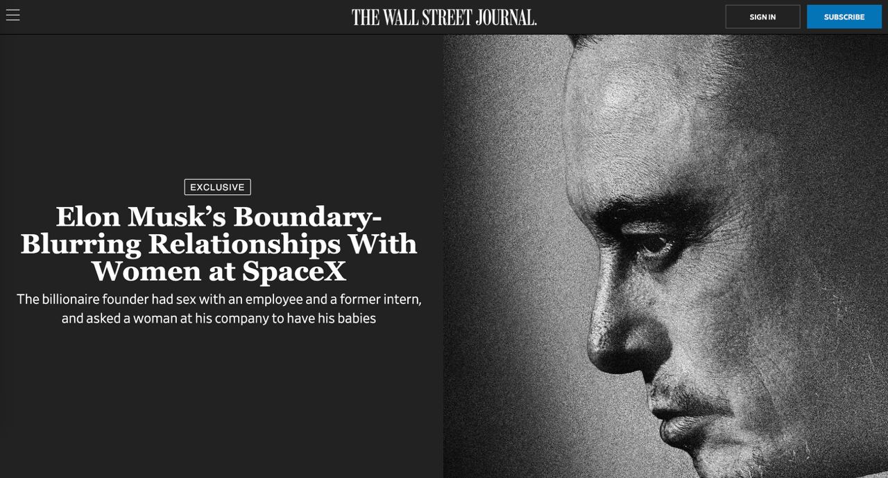 Стверджується, що одну стажерку SpaceX мільярдер наполегливо запрошував до себе, другій обіцяв коня за секс, а від третьої вимагав народити йому дітей. І подібне нібито відбувалося довгі роки.